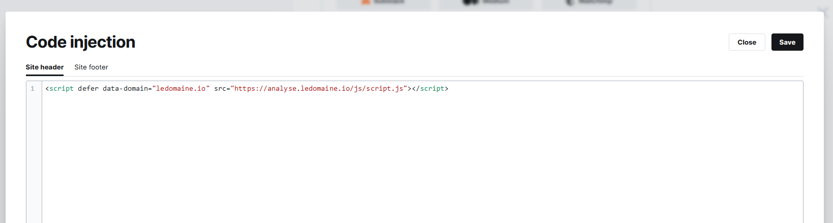 Pour configurer Plausible dans Ghost CMS, il vous faut vous rendre dans Settings → Code Injection et ajouter le code de plausible dans la boite de dialogue.